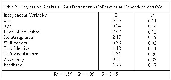 The autonomy variable turned out to be a strong predictor of satisfaction with supervisors (b = 0.18). This results shows that there is a statistically significant relationship between autonomy and satisfaction with supervisors. As expected, such variables as skill variety, task identity, age, and task significance have significant positive influences on public officials satisfaction with their supervisors. Satisfaction with ColleaguesA test of the model produced an R=square of 0.56 for the dependent variable, satisfaction with colleagues, indicating that over 56% of the variance was explained by the nine variables in the model (Table 3).