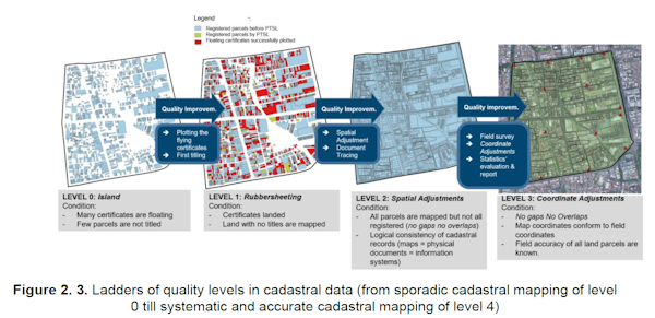 The International Federation of Surveyors (FIG) and The World Bank had published principles and guidelines to give a way forward to accelerate the land registration progress called Fit-for-Purpose Land Administration (FFP-LA) (FIG Publication No. 60 by Stig Enemark, Keith Clifford Bell, Christiaan Lemmen and Robin McLaren).