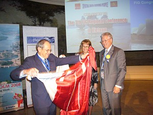 Svante Astermo and Maria Ulfvarsson Östlund gave the FIG banner to Haim Srebro, Conference Director of FIG2009.